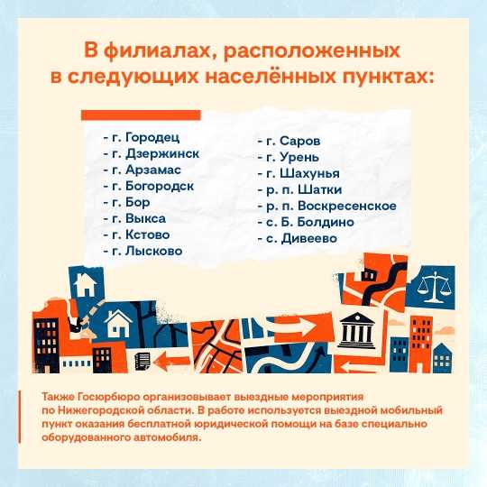 Государственное юридическое бюро по Нижегородской области с 2020 года предоставляет гражданам всех видов льготной категории бесплатную квалифицированную помощь: устные и письменные консультации, составление правовых документов, представительство в органах и судах.