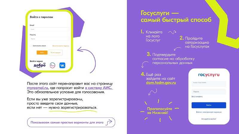 Для голосования необходимо авторизоваться в АИС «Молодежь России», либо пройти быструю регистрацию через VK ID, Госуслуги или dobro.ru.