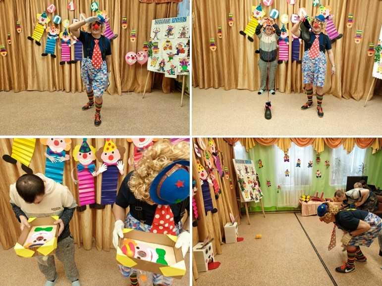 Для мероприятия были подготовлены увлекательные конкурсы, весёлые музыкальные и танцевальные сюрпризы, творческая выставка «Весёлые клоуны», а на праздник пришли забавные артисты – клоун Прошка и Веселинка.