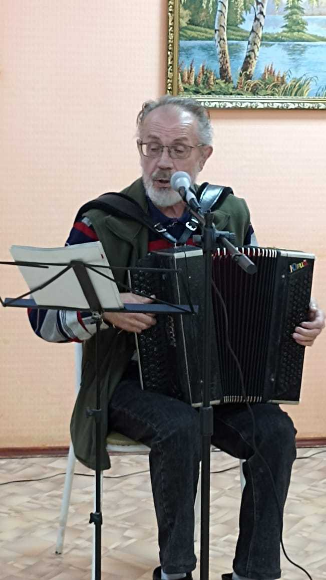 Его выступление сопровождалось живым звуком баяна, исполнившего любимые народные мотивы и личные авторские композиции. Среди произведений особое впечатление произвели трогательные песни «Родная Шаранга», «Тепло в деревне», «Девочка из детства», «Старенький альбом», «Я люблю» и особенно затронуло всех за душу строчки песни «Журавли», вызвавшие слёзы умиления и воспоминаний.