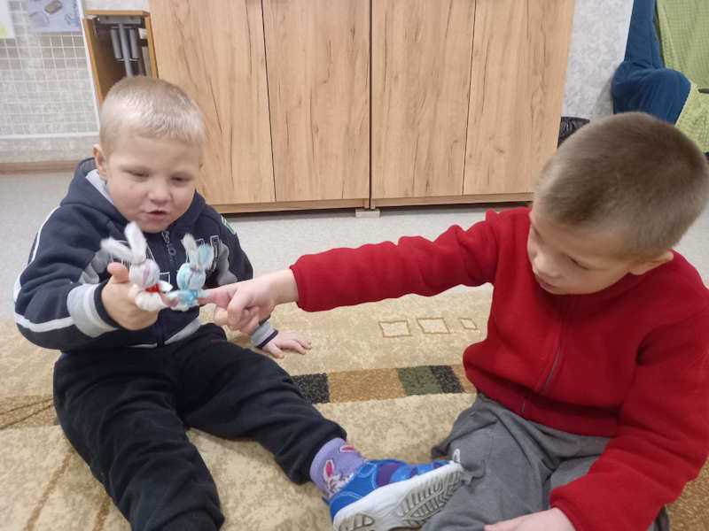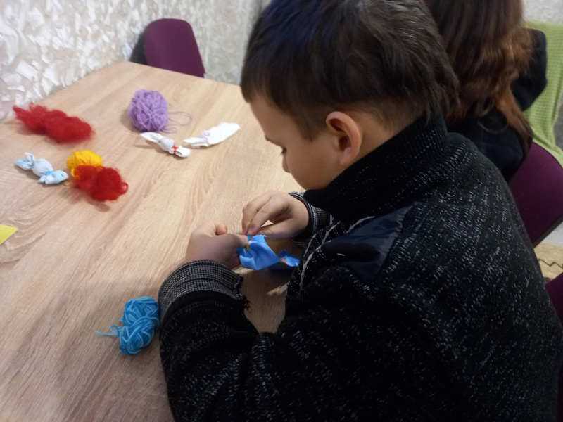 Сегодня воспитанники Центра совместно с воспитателем приняли участие в увлекательном мастер-классе по изготовлению игровой куклы-мотанки «Зайчик на пальчик» из ткани.