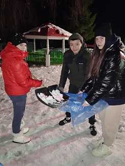 Желая проявить себя в «снежном творчестве», дети решили не дожидаться, когда выпадет снег и дружно принялись за работу. Ребята раскладывали снег по пакетам и получились заготовки для снеговика. Шапочку, шарфик и нос-морковку ребята сшили своими руками.