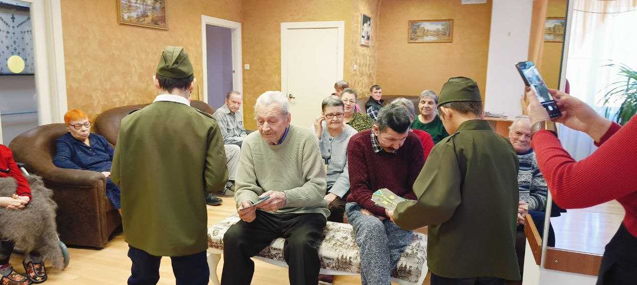Дети поздравили дедушек и всех проживающих с наступающим праздником, Днём защитника Отечества и вручили им открытки, сделанный своими руками.