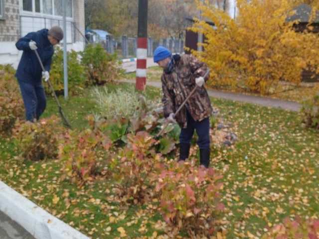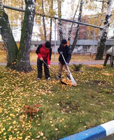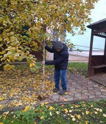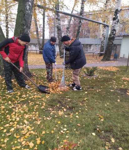 Получатели социальных услуг под руководством инструктора производственного обучения рабочих массовых профессий приводили в порядок территорию сгребали опавшую листву.