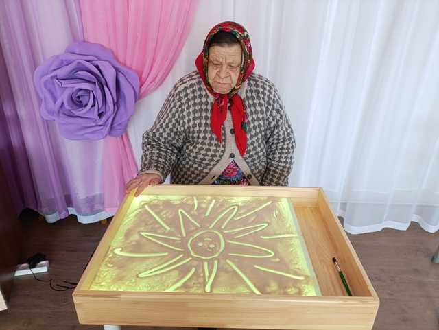 Специалист по социальной работе провёл для получателей социальных услуг занятие по рисованию песком.