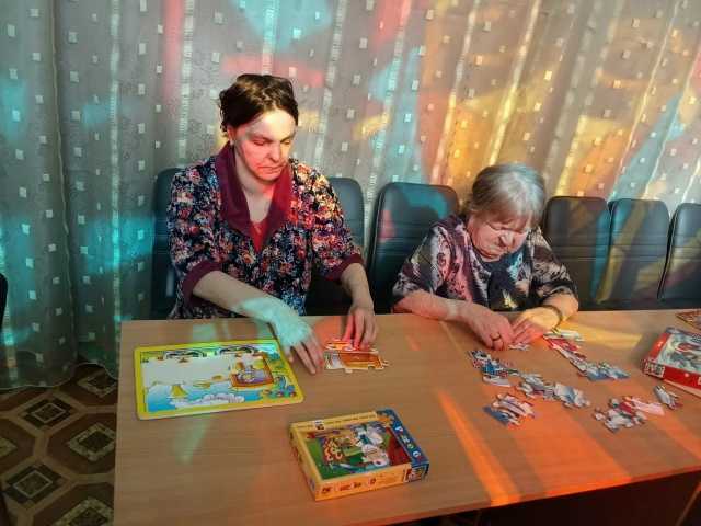 Специалист по социальной работе для получателей социальных услуг провела развивающее занятие по собиранию пазлов.