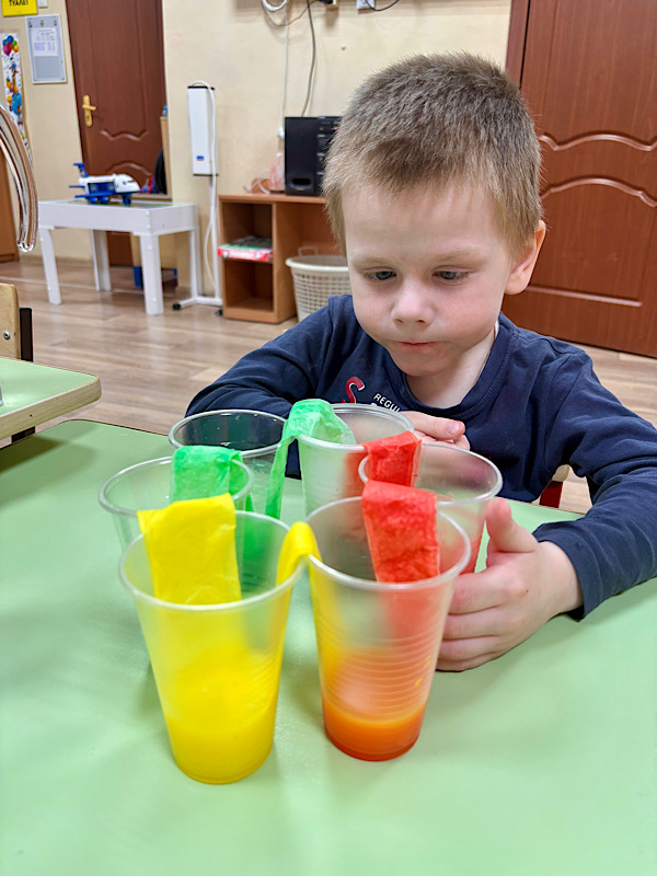 Вместе с воспитателем Борисовой Валентиной Викторовной ребята усвоили ключевые характеристики воды: её прозрачность, отсутствие запаха, способность принимать форму ёмкости, текучесть, растворяющие свойства, а также возможность замерзать и менять цвет. В ходе опыта "Шагающая вода" ребята наблюдали, как вода поднимается по салфеткам, смешивая соседние цвета и образуя новые.