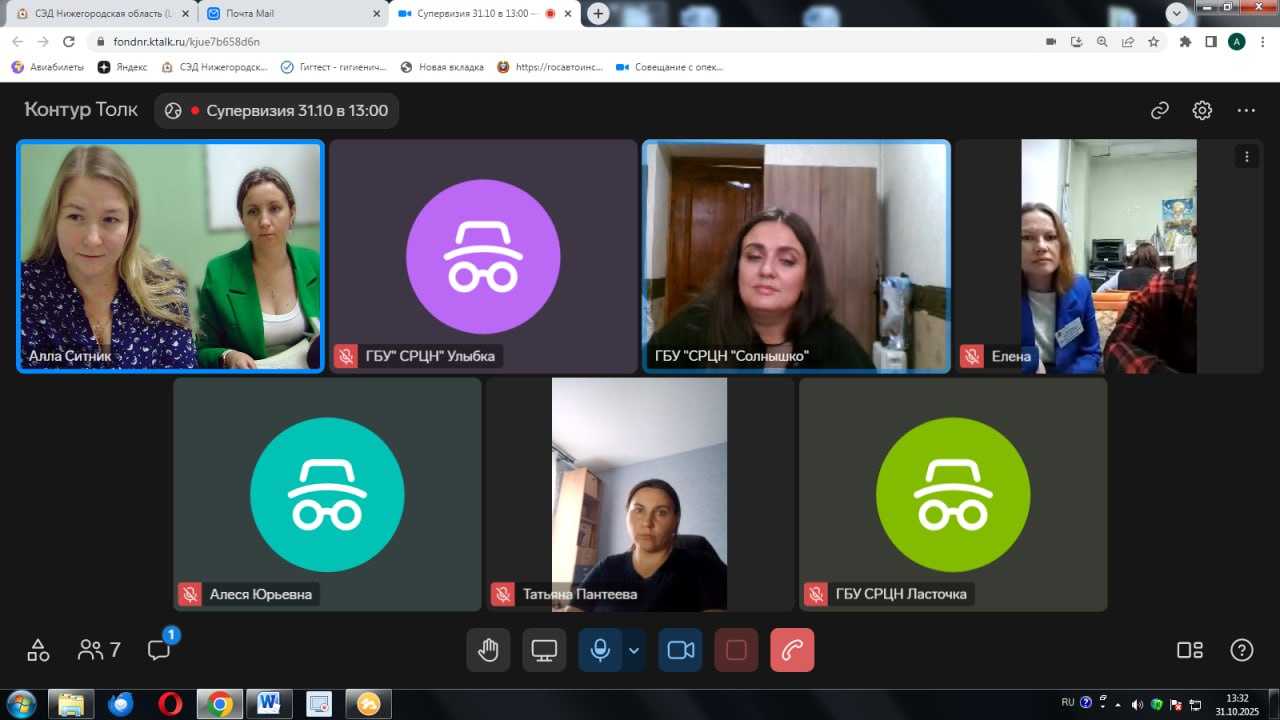 В рамках данных супервизий разобрали три сложных случая, представленных специалистами из ГБУ «СРЦН «Остров надежды» Большемурашкинского муниципального округа, ГБУ «СРЦН «Радуга» Ветлужского муниципального округа и ГБУ «СРЦН «Солнышко» Ленинского района г. Н. Новгорода.