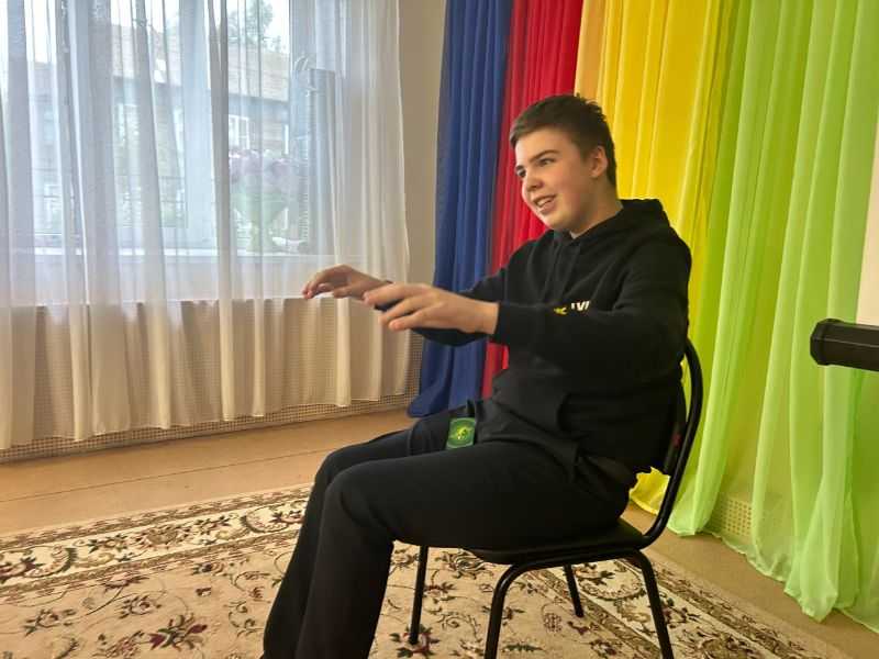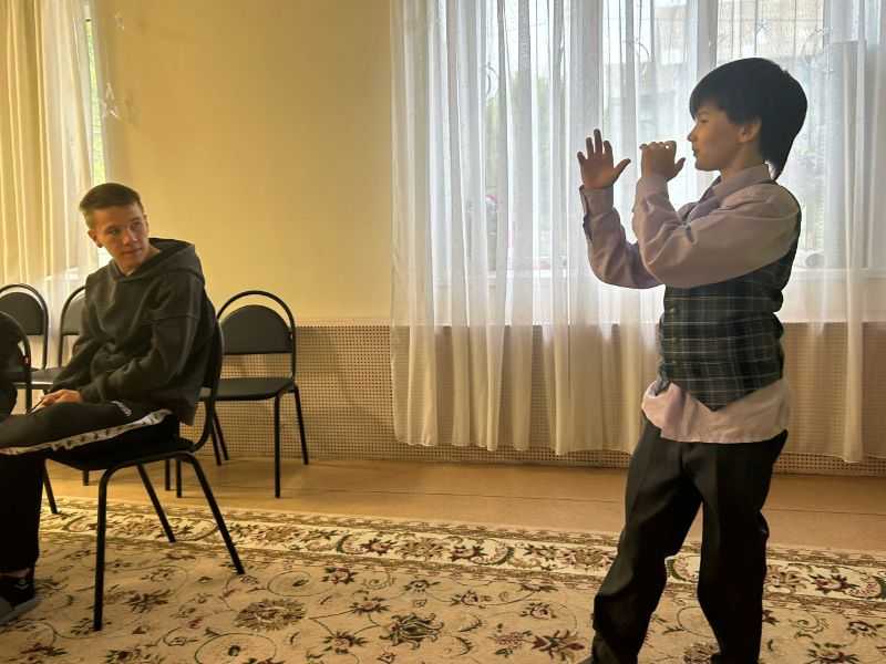 На занятиях с психологом воспитанники стационарного отделения отрабатывают навыки невербального общения: с помощью жестов и различных поз пытаются объяснить содержание карточек психологической игры «показуха».