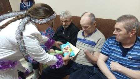 Сегодня директор дом-интерната поздравила получателей социальных услуг с наступающим Новым годом и Рождеством. Дед мороз и Снегурочка вручили проживающим сладкие подарки и сувениры сделанные своими руками детьми из Красногорской школы и сладкие подарки и открытки от учеников 5 "з" класса МБОУ "Школа №88" Новинская г.Н. Новгород.